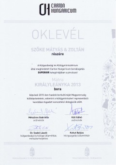 A Külgazdasági és Külügyminisztérium által meghirdetett Carton Hungaricum borválogatás SUPERIOR kategóriájában a pincészet MÁTRAI KIRÁLYLEÁNYKA 2013 bora képviseli 2015-ben hazánk borkultúráját Magyarország külképviseletein, valamint a külügyminiszteri reprezentáció keretében fogadott nemzetközi delegációk előtt.